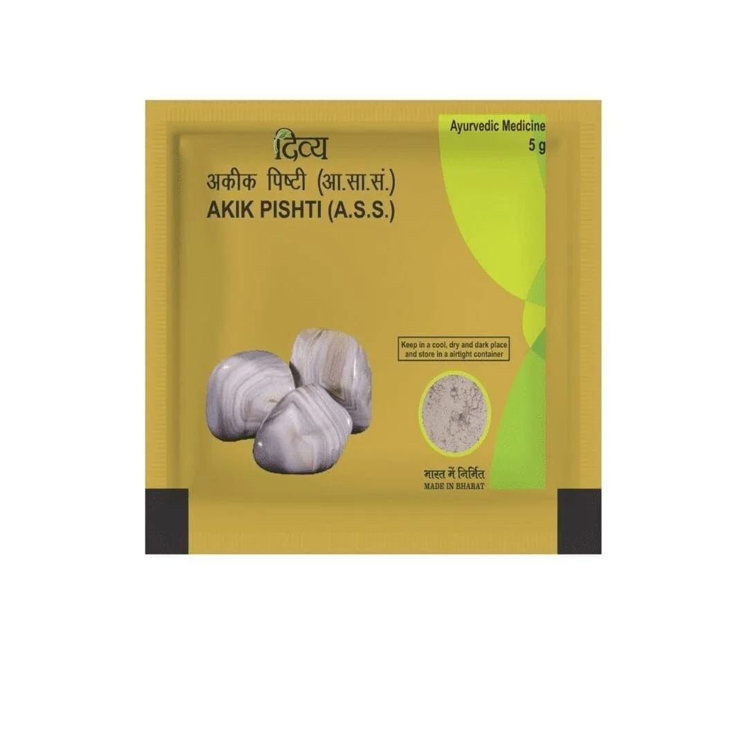 Divya Akik Pishti 5 gm is a classical Ayurvedic mineral preparation made from purified Akik (Agate). Traditionally used to support heart health, mental calmness, stress relief, and emotional balance, it helps manage palpitations, anxiety, and restlessness naturally.