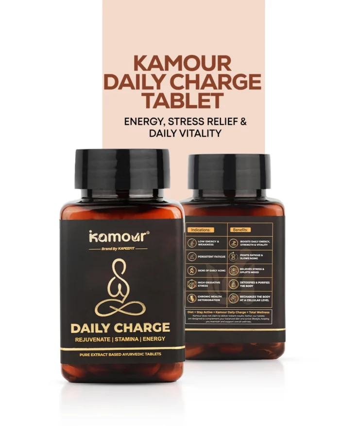 In today’s fast-paced lifestyle, where mental stress, fatigue, and lack of energy have become everyday challenges, Kamour Daily Charge Tablet offers a holistic Ayurvedic solution. Crafted with a powerful combination of adaptogenic and rejuvenating herbs, it supports your physical strength, emotional balance, and mental clarity.