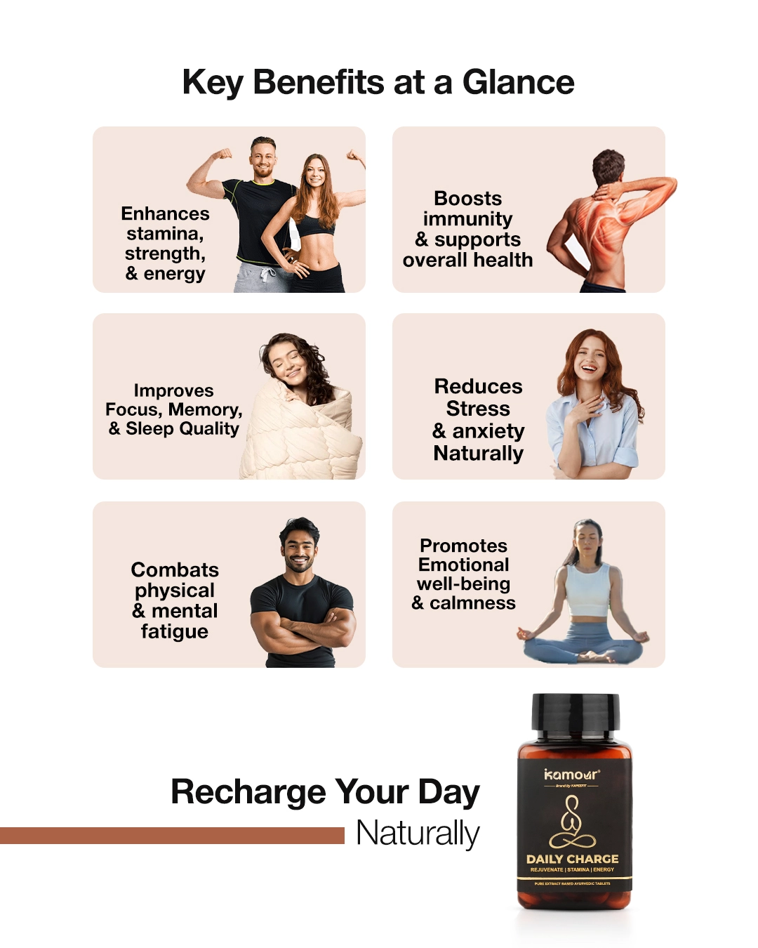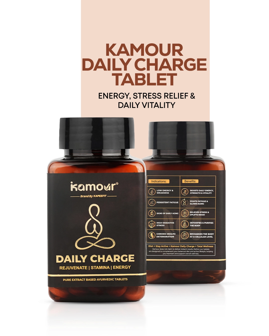 Unlike synthetic energy boosters, Kamour Daily Charge Tablet rejuvenates your body from within. Its adaptogenic Ayurvedic blend not only combats fatigue but also promotes calmness, focus, and overall vitality — helping you feel naturally charged every day.